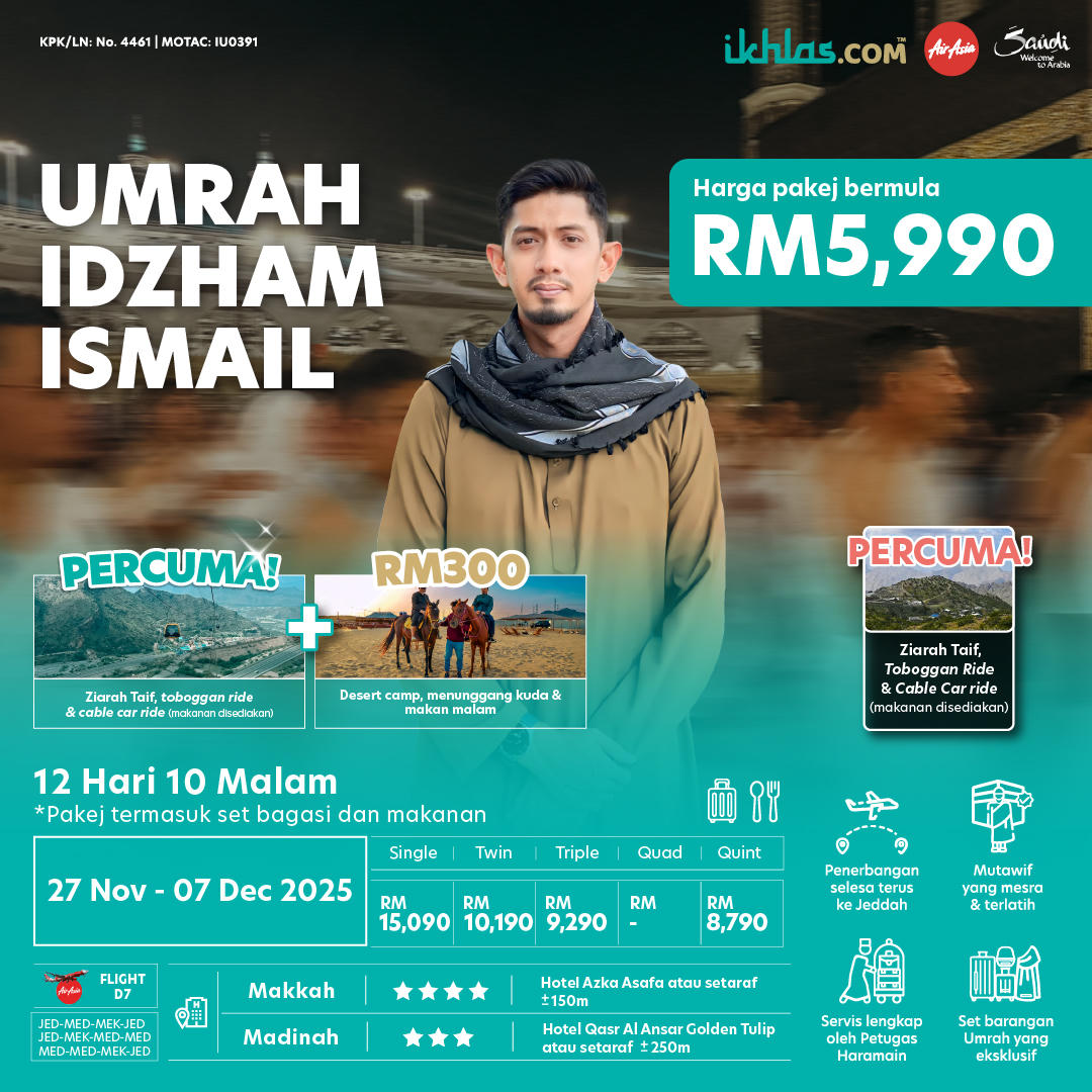 - Umrah Idzham Ismail untuk 12 hari 10 malam pakej termasuk set bagasi dan makanan. (RM 5990)