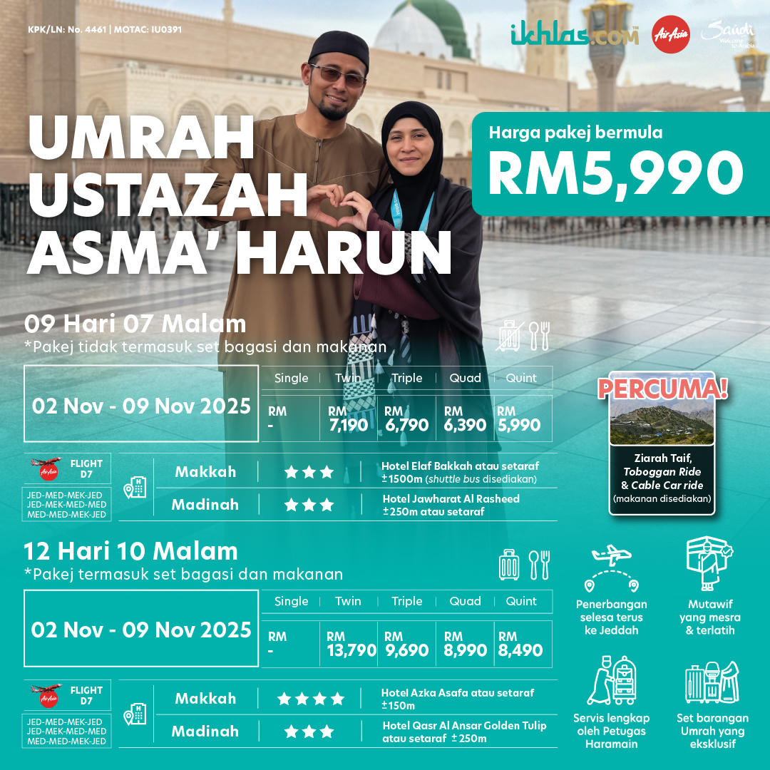 - Umrah Ustazah Asma’ Harun 9 hari 07 malam & 12 hari 10 malam pakej tidak termasuk set bagasi dan makanan. (RM 5990)