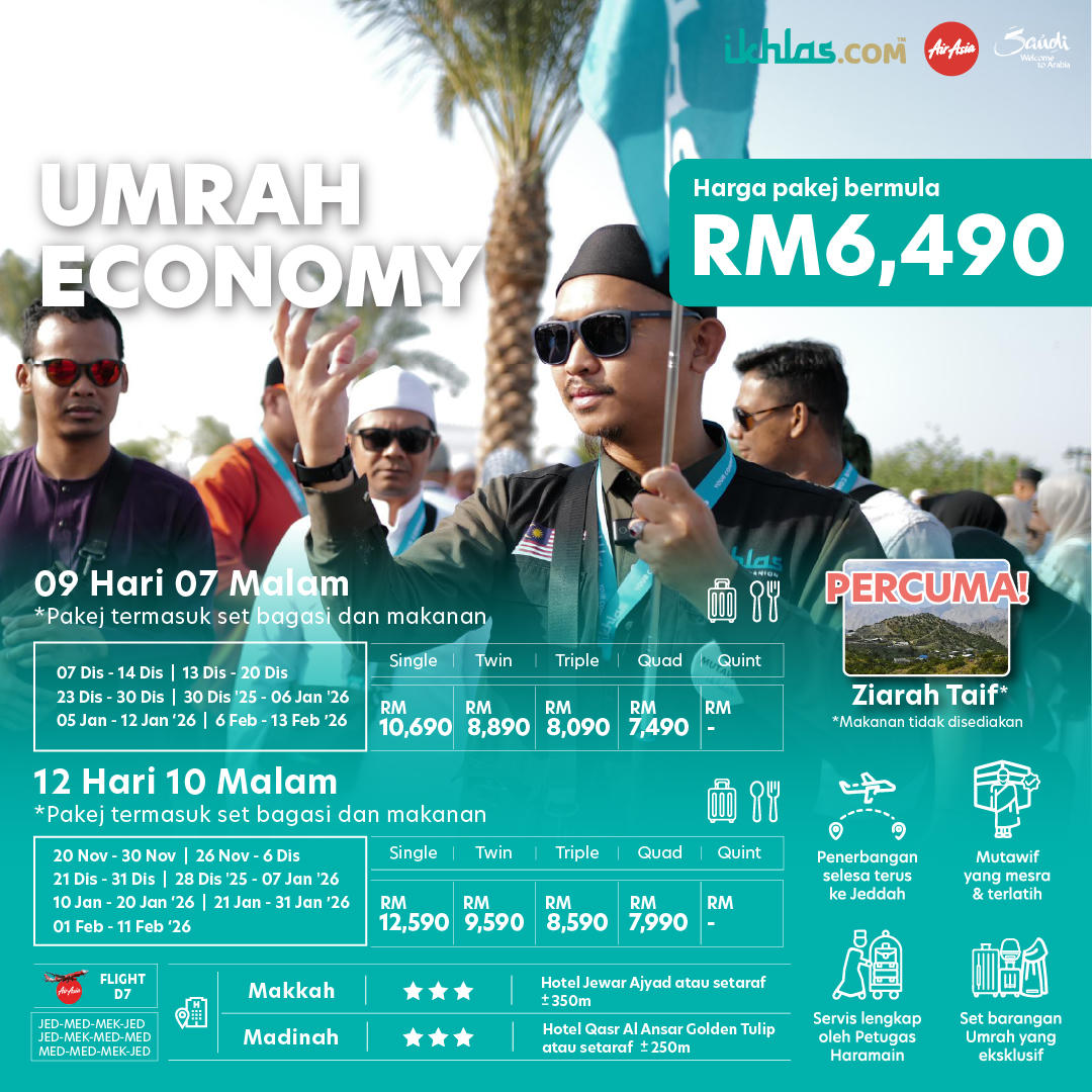 - Umrah Economy 9 hari 07 malam 7 & 12 hari 10 malam pakej termasuk set bagasi dan makanan. (RM 6490)