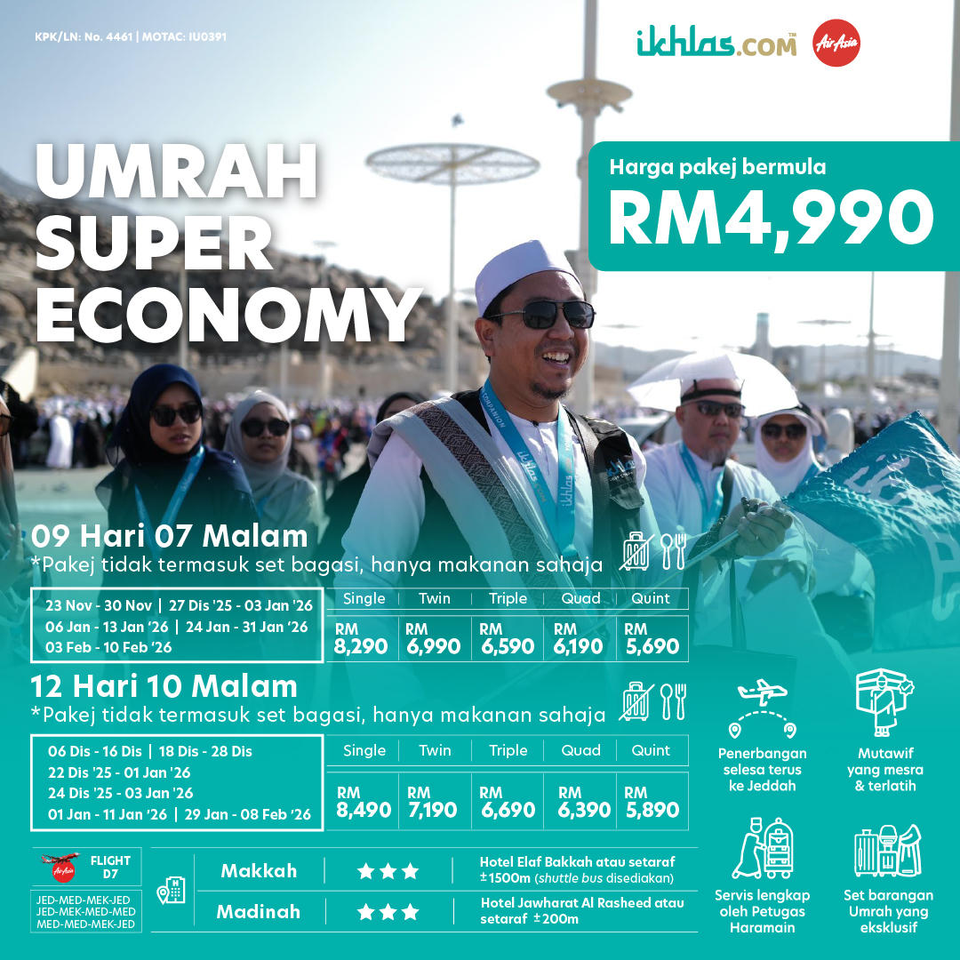 - Umrah Super Economy 9 hari 07 malam & 12 hari 10 malam pakej tidak termasuk set bagasi dan makanan. (RM 4990)