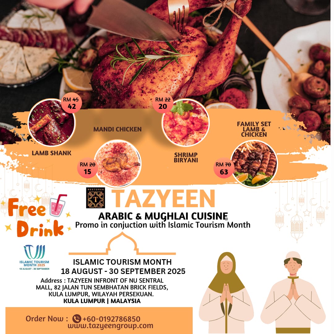 In celebration of Islamic Tourism Month (18 Aug – 30 Sept 2025), TAZYEEN invites you to experience the rich flavors of Arabic & Mughlai cuisine at exclusive promotional prices.