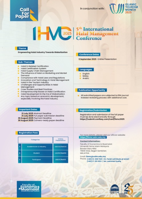 📖 The International Halal Management Conference (IHMC) is one of the conferences aimed at branding Universiti Sains Islam Malaysia (USIM) through the Faculty of Economics and Muamalat (FEM), and it is held biennially.